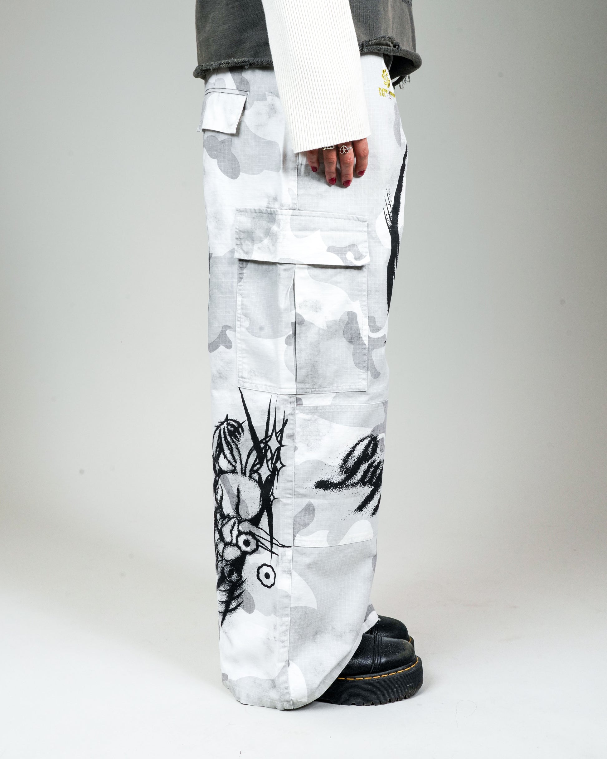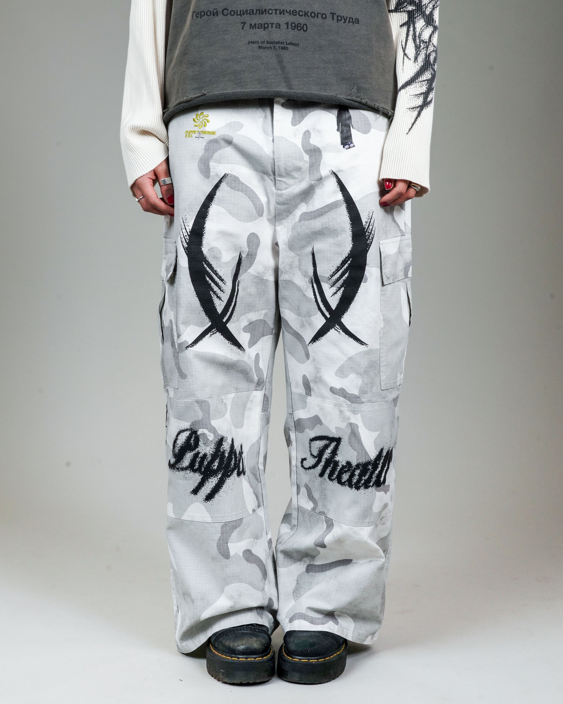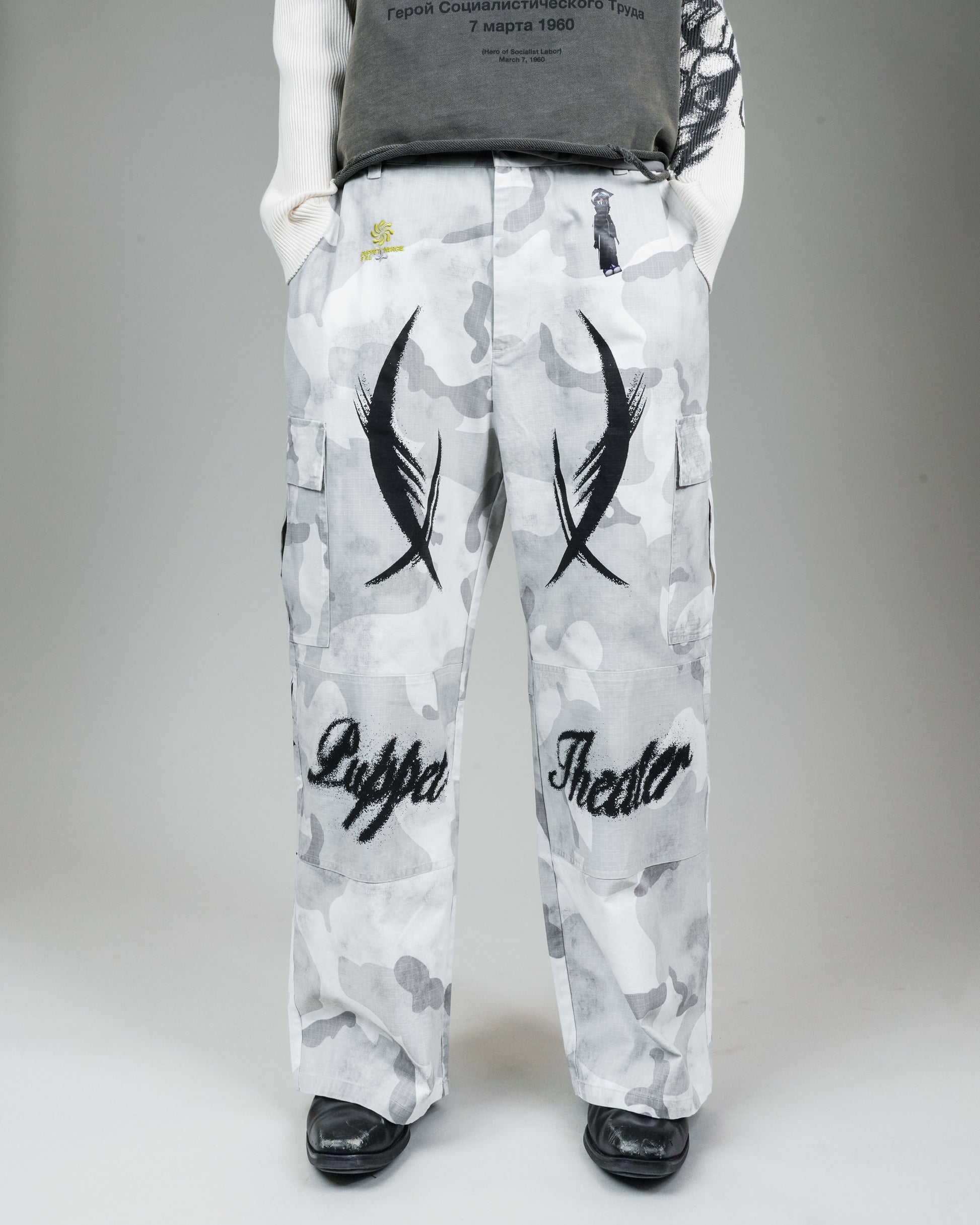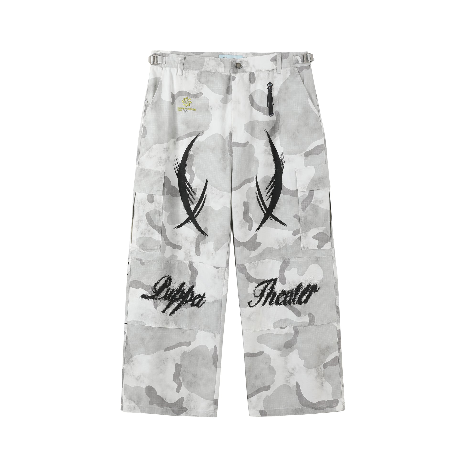 -The appliqué version of the BDU Cargo has Puppet Theater iconography and logos throughout. Airbrush-style graphics applied via DTG at thigh, knee, and back calf. Puppet Theater characters applied via heat transfer at front and back hip.