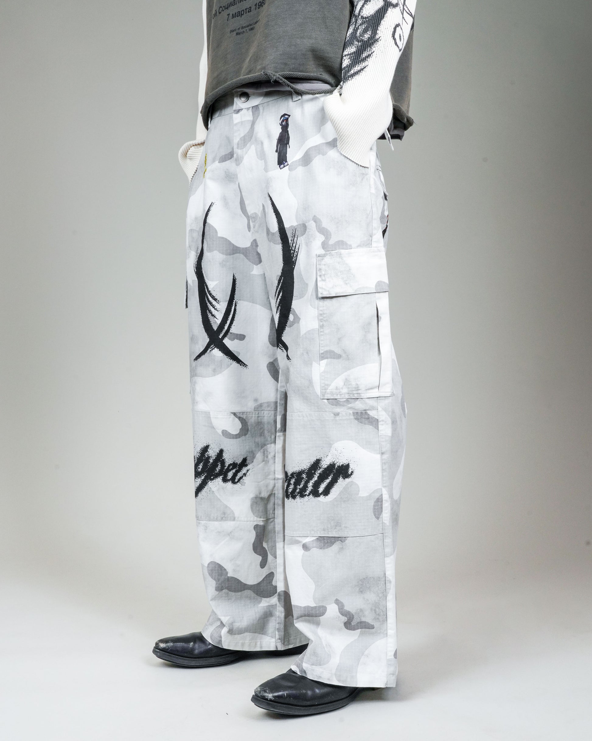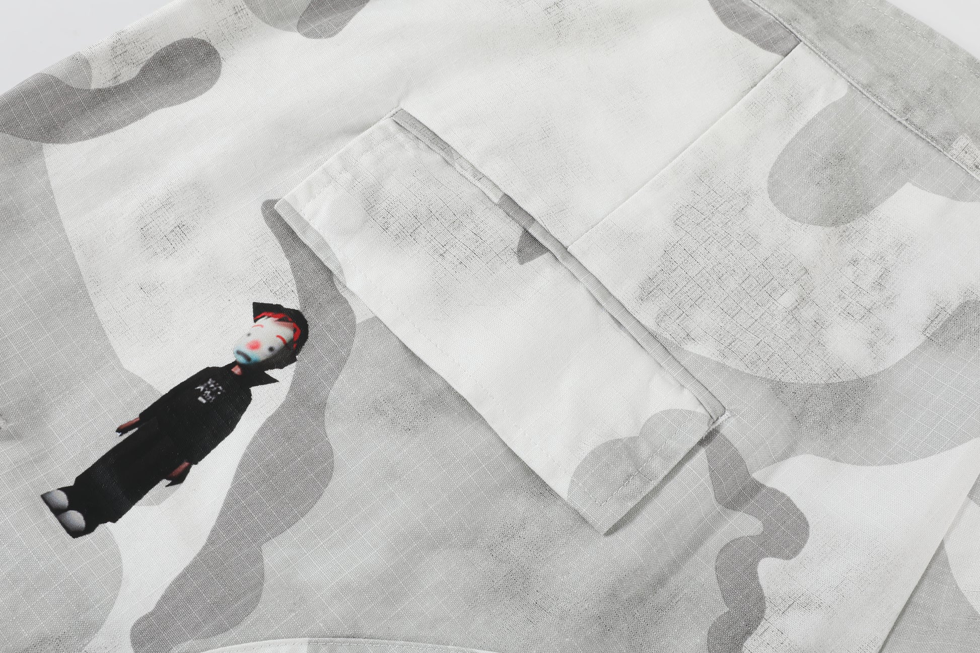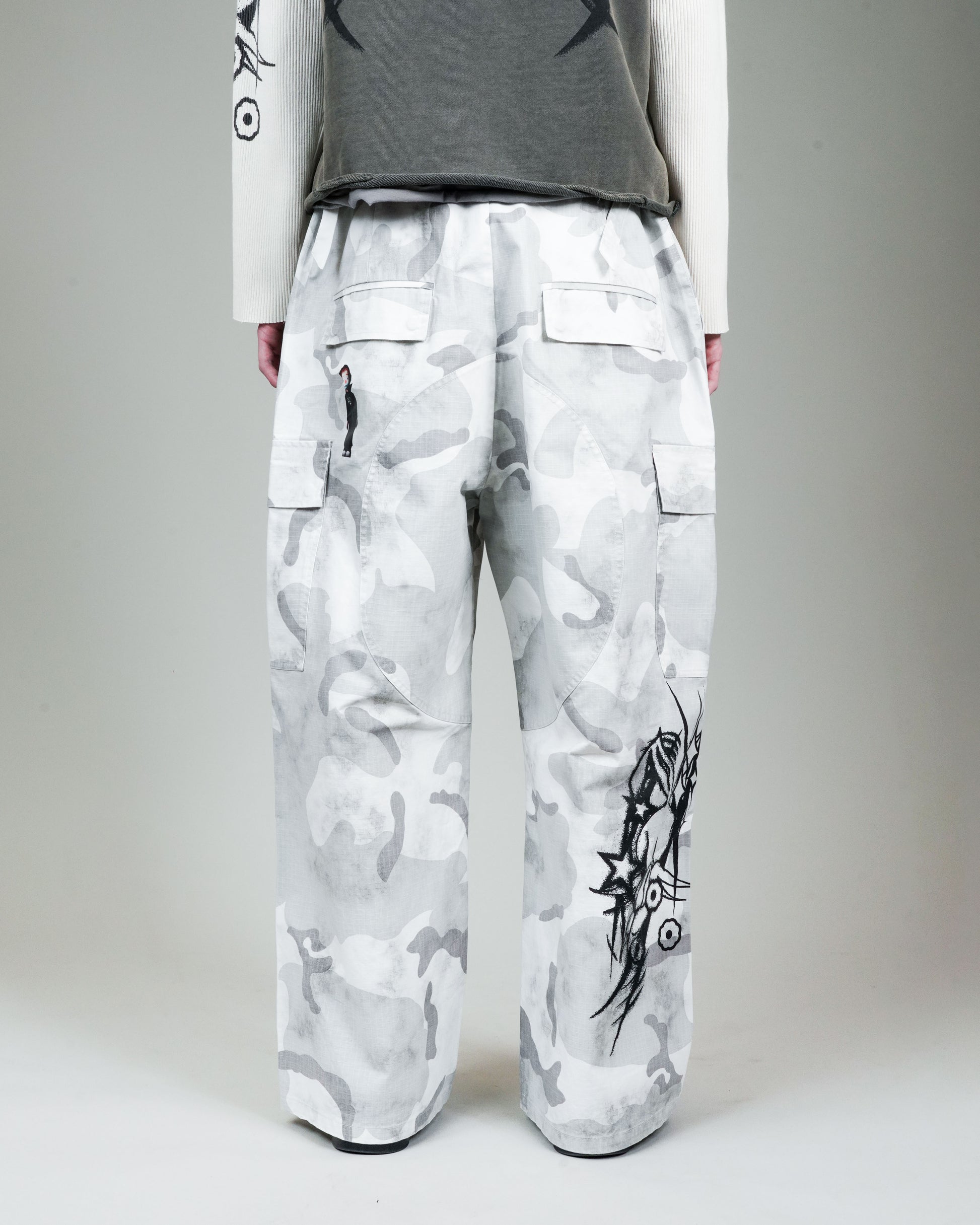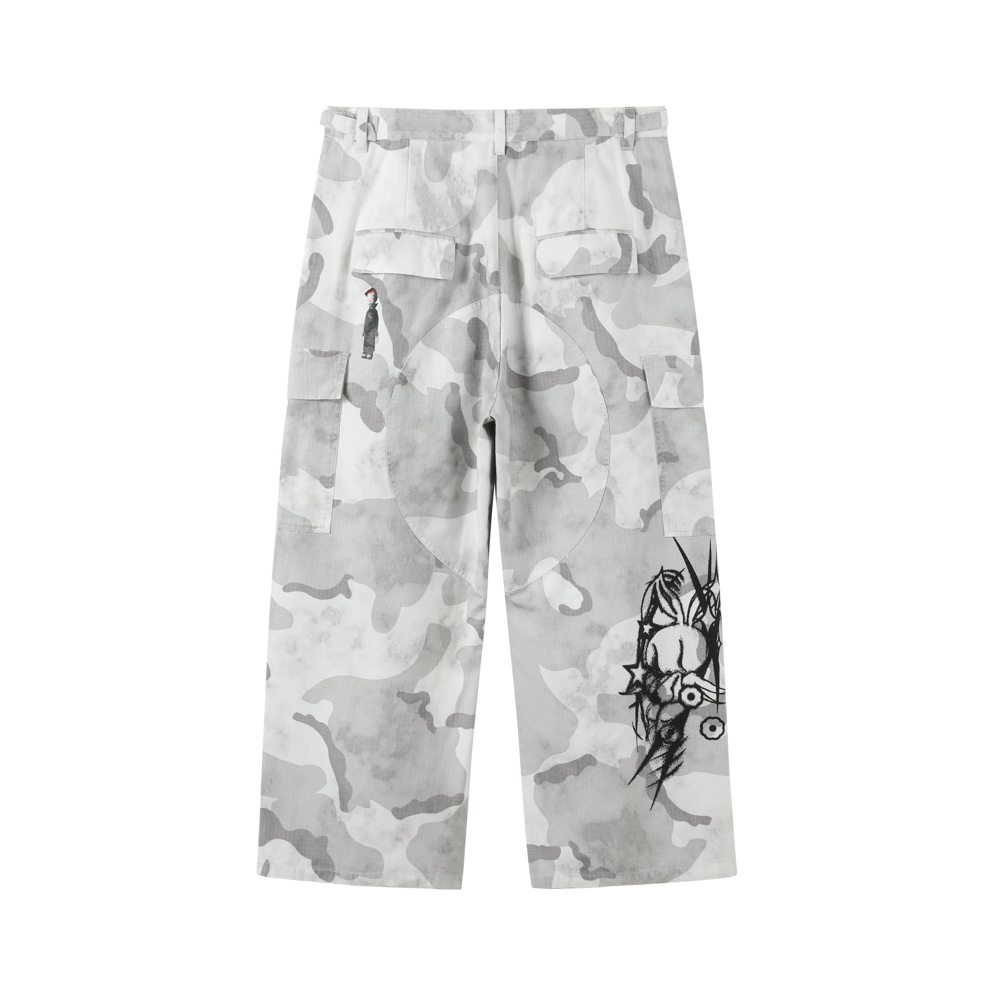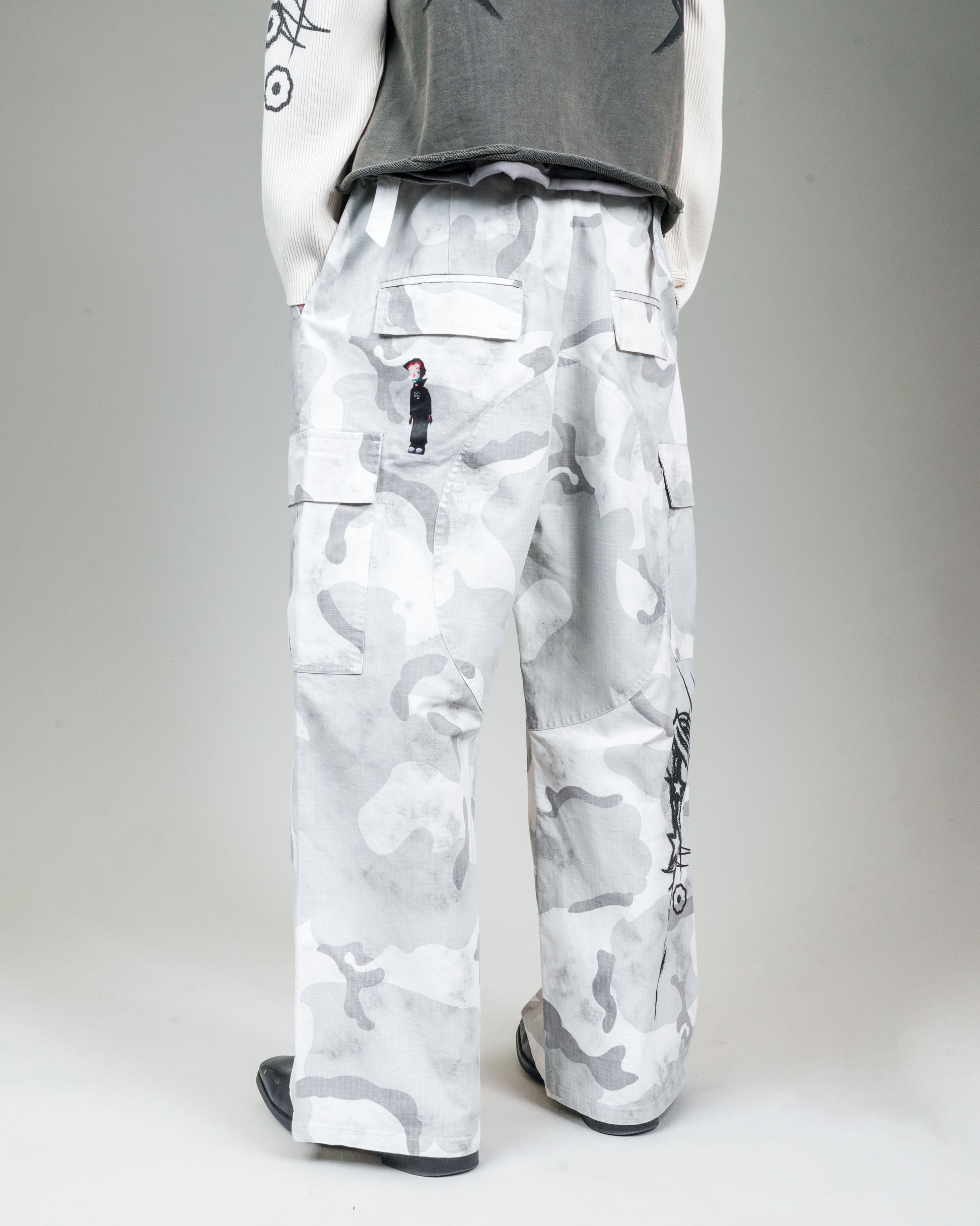 -The appliqué version of the BDU Cargo has Puppet Theater iconography and logos throughout. Airbrush-style graphics applied via DTG at thigh, knee, and back calf. Puppet Theater characters applied via heat transfer at front and back hip.
