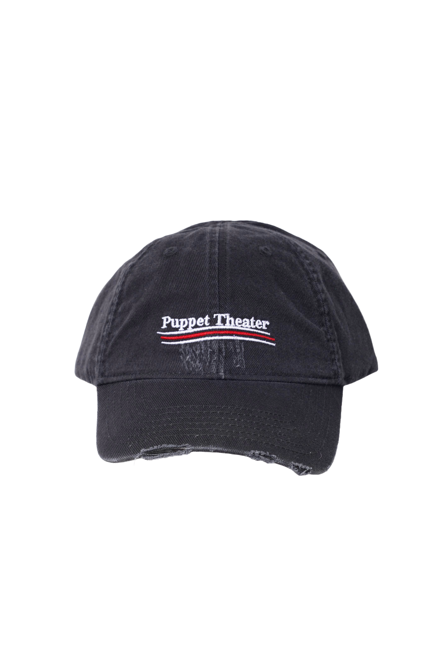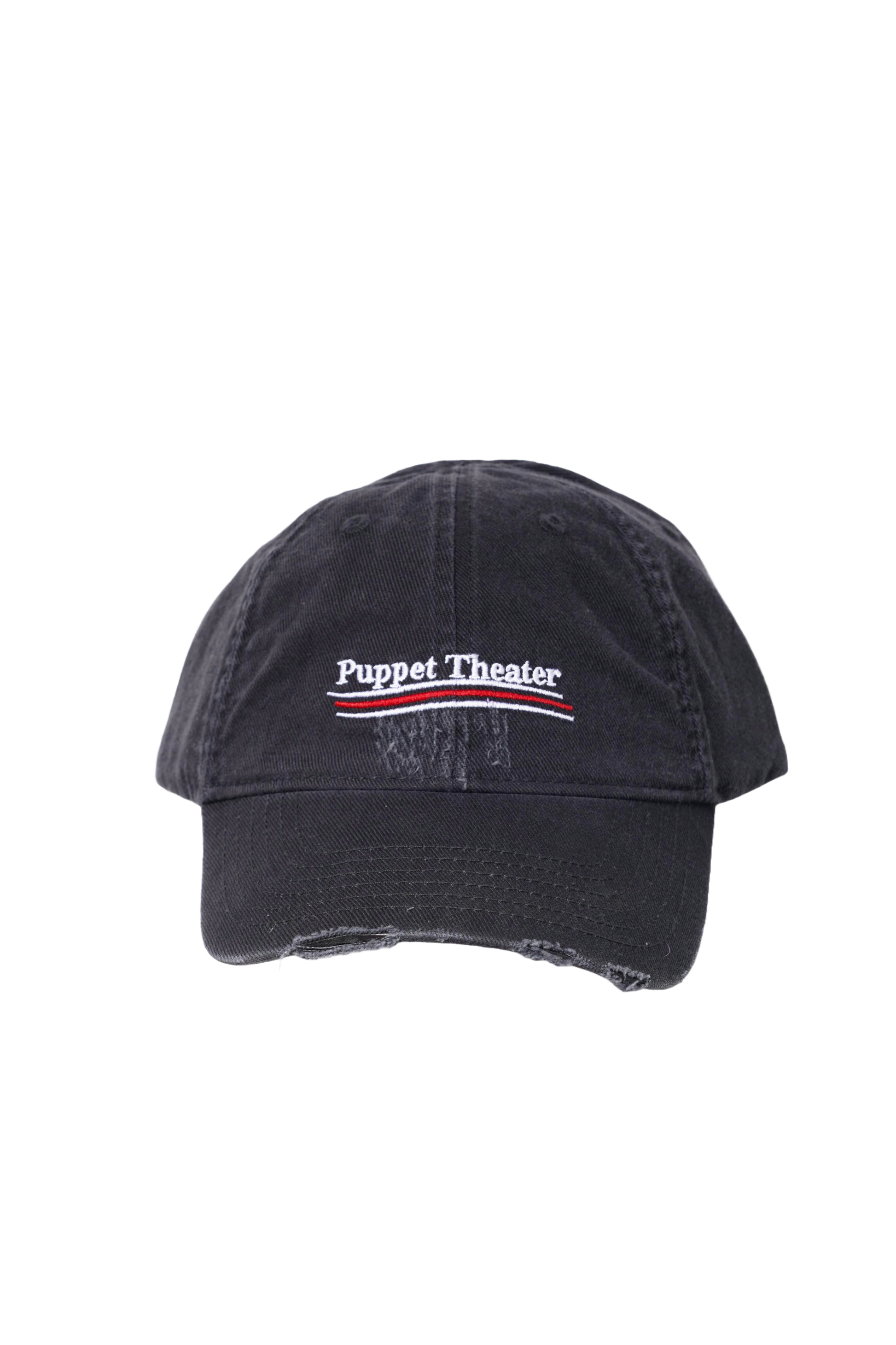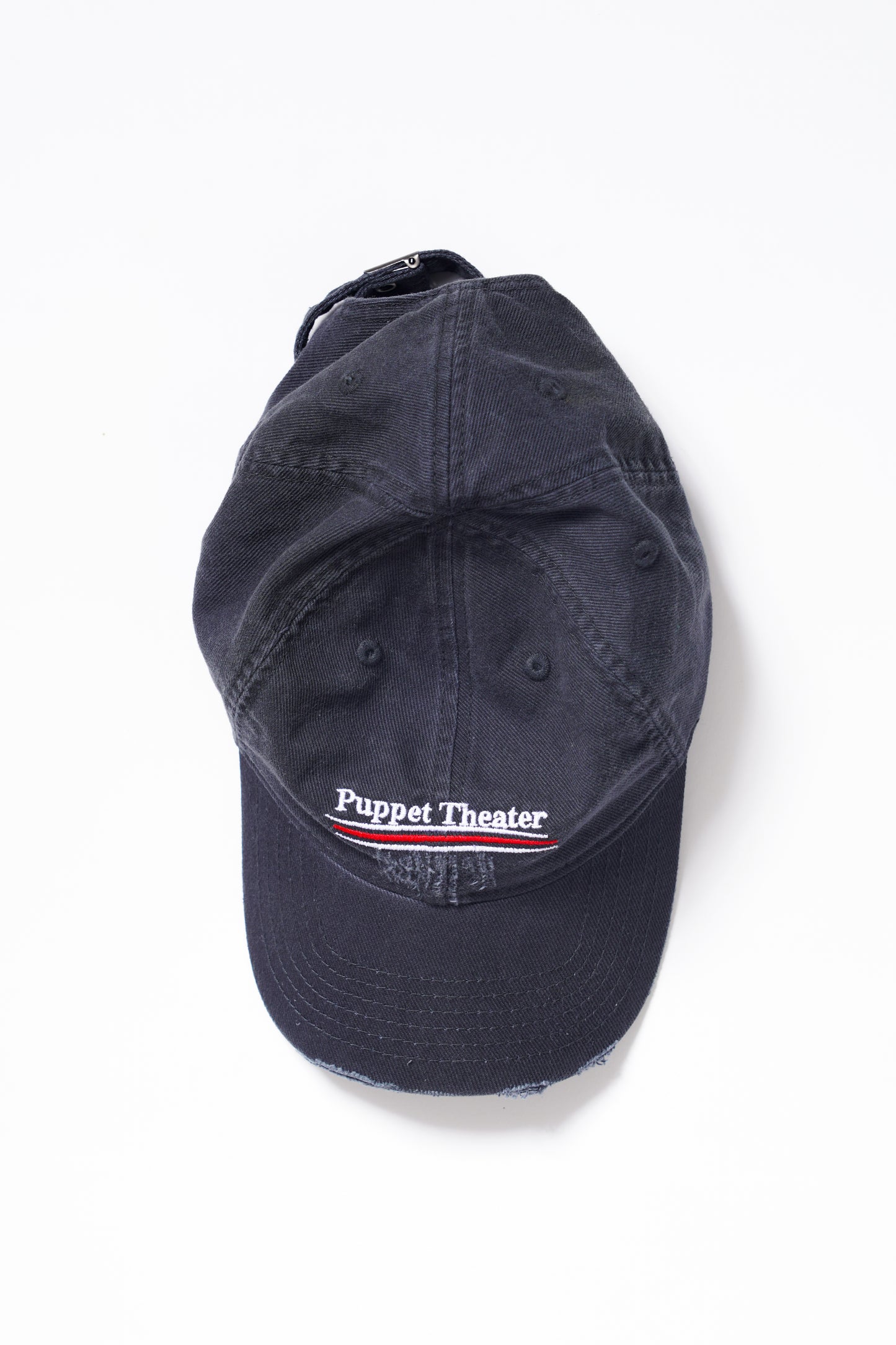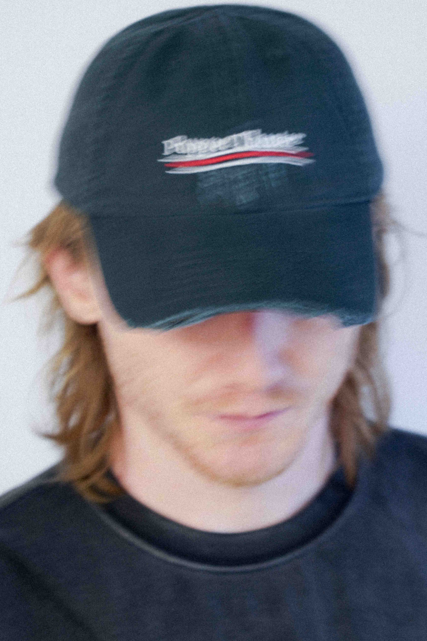 Inspired by american politics. one big joke. constructed from a heavyweight, piece dyed charcoal canvas. logo applied via machine process embroidery. heavily distressed all over. woven inner logo label. lined with woven ultrafine cotton. adjustable metal clasp closure at rear.
