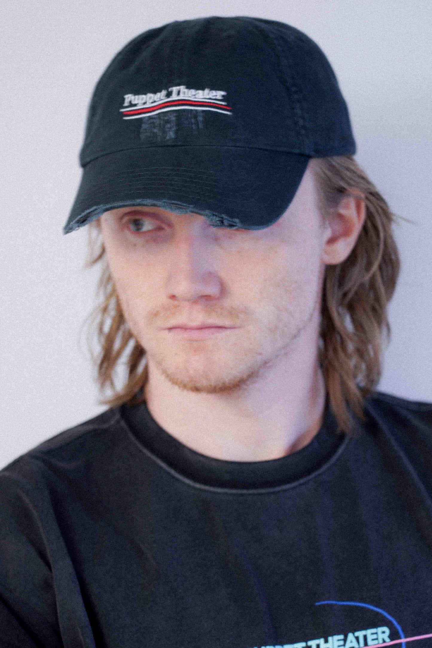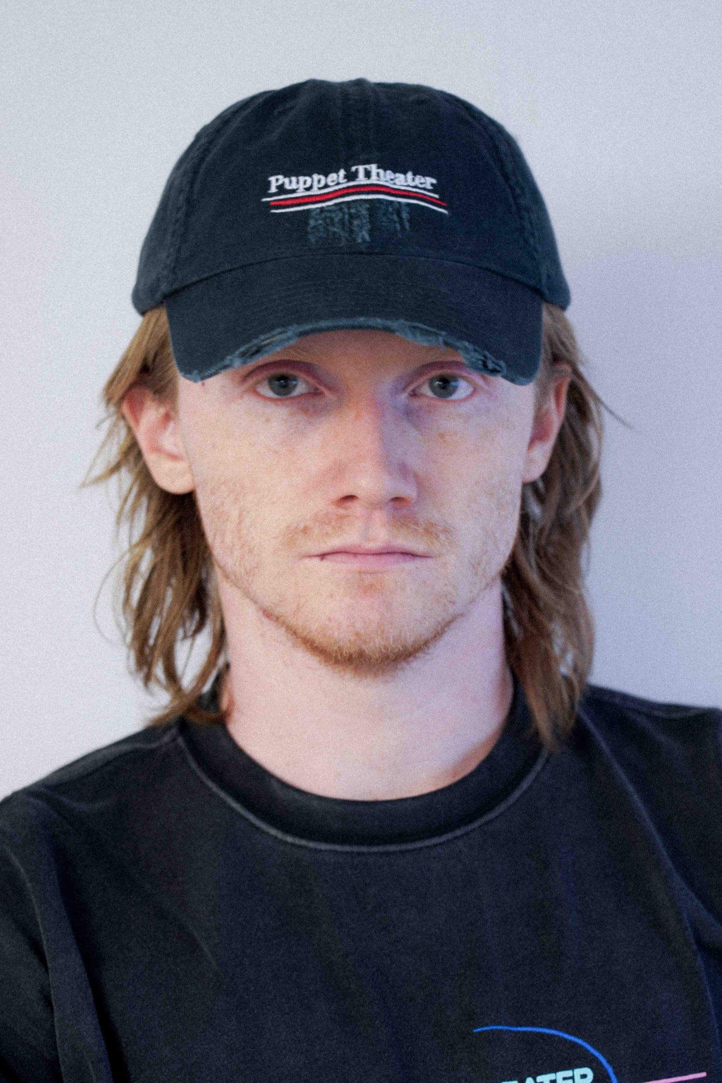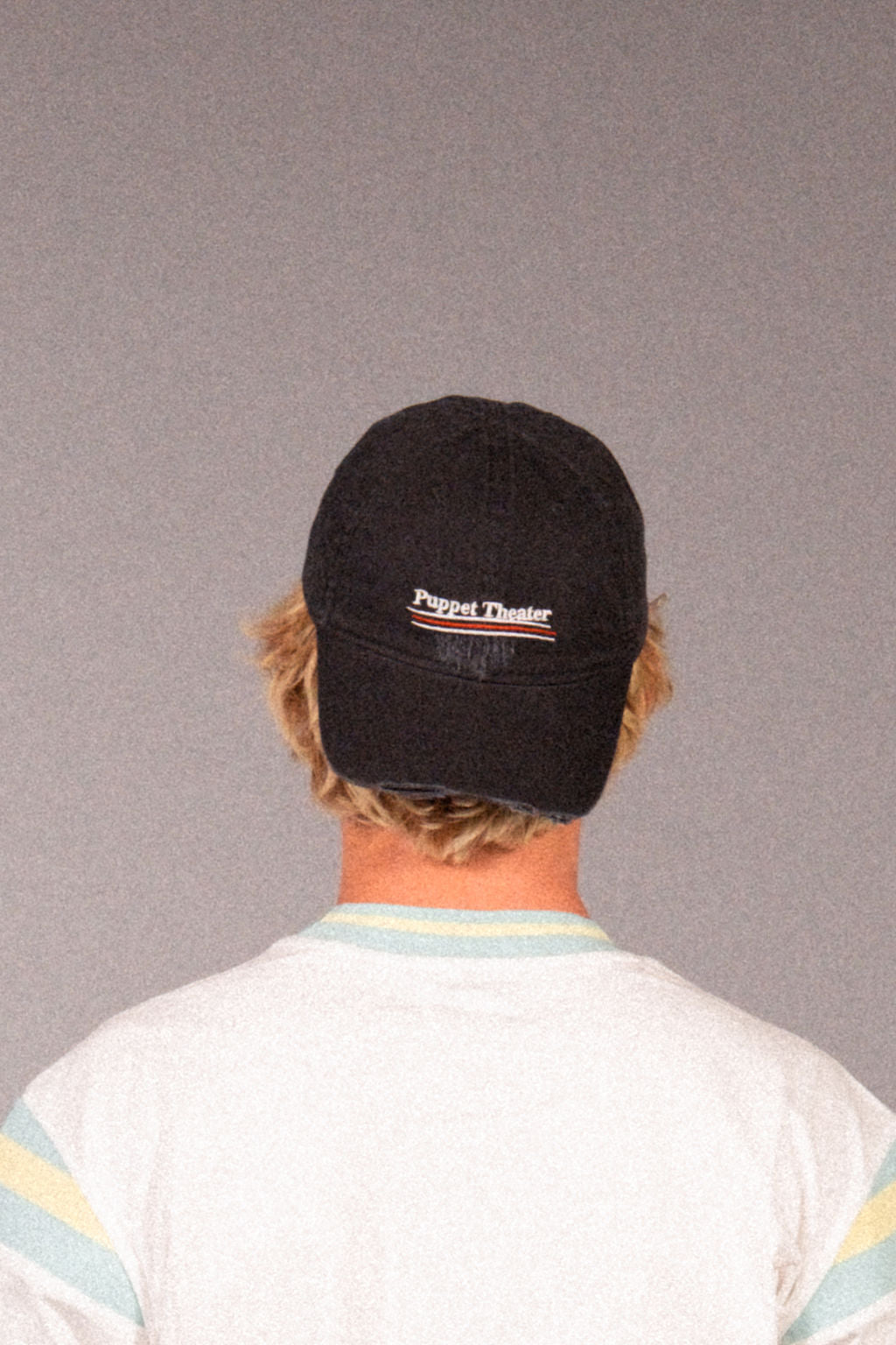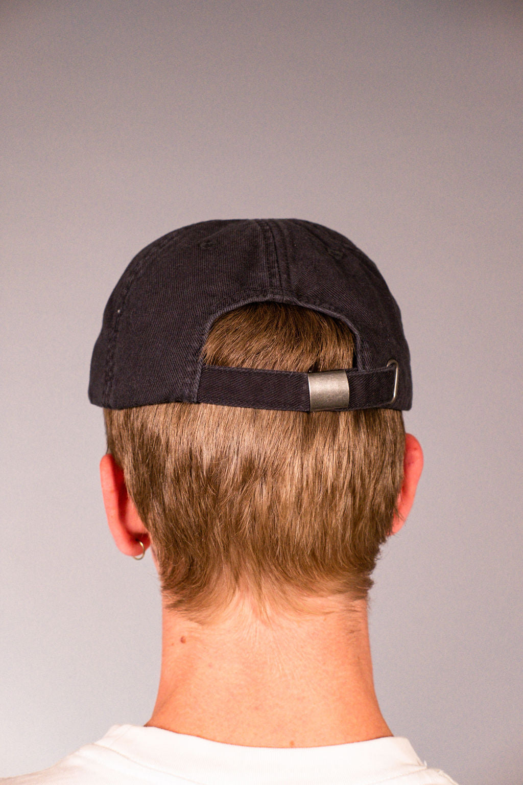 Inspired by american politics. one big joke. constructed from a heavyweight, piece dyed charcoal canvas. logo applied via machine process embroidery. heavily distressed all over. woven inner logo label. lined with woven ultrafine cotton. adjustable metal clasp closure at rear.